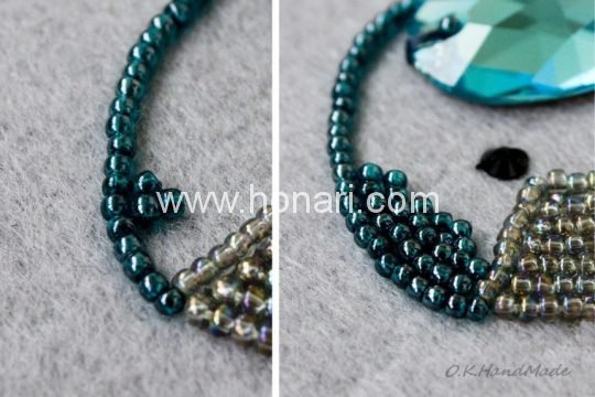 اگر بعد از اتمام کار، بخشهایی خالی ماند یا احساس کردید منجوقهای شما در آن فضا جا نمیشوند، میتوانید برای پر کردن آن قسمتها از منجوقهای همرنگ اما سایز کوچکتر استفاده کنید.