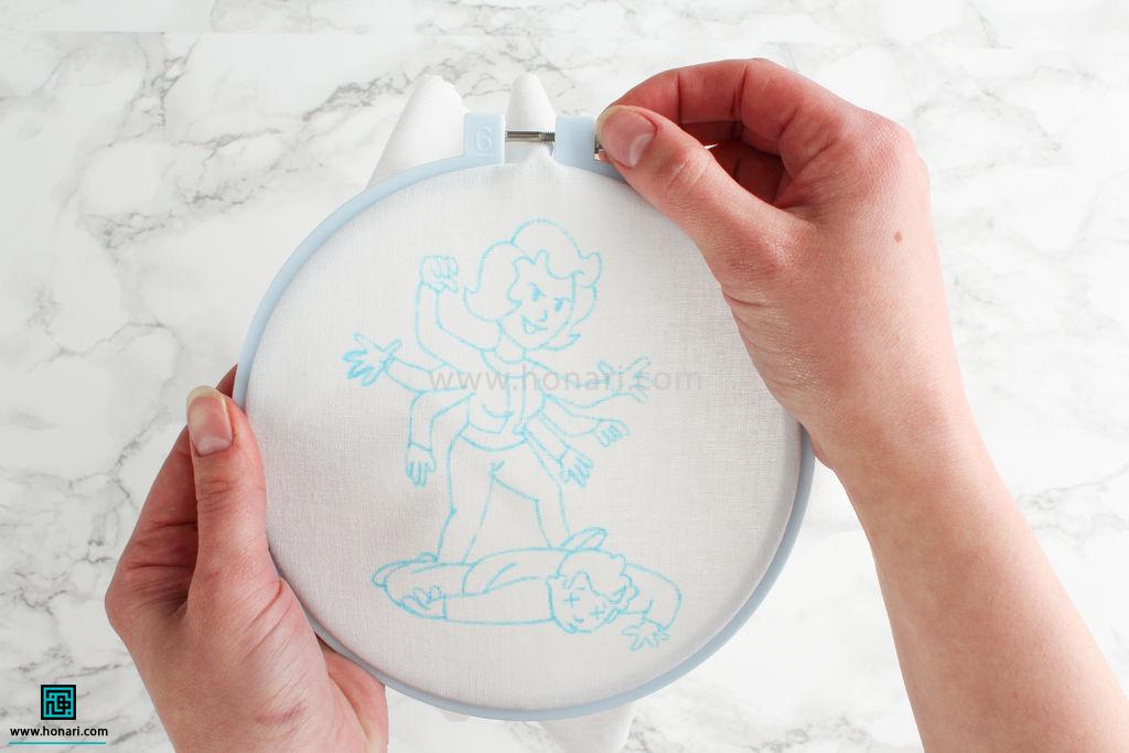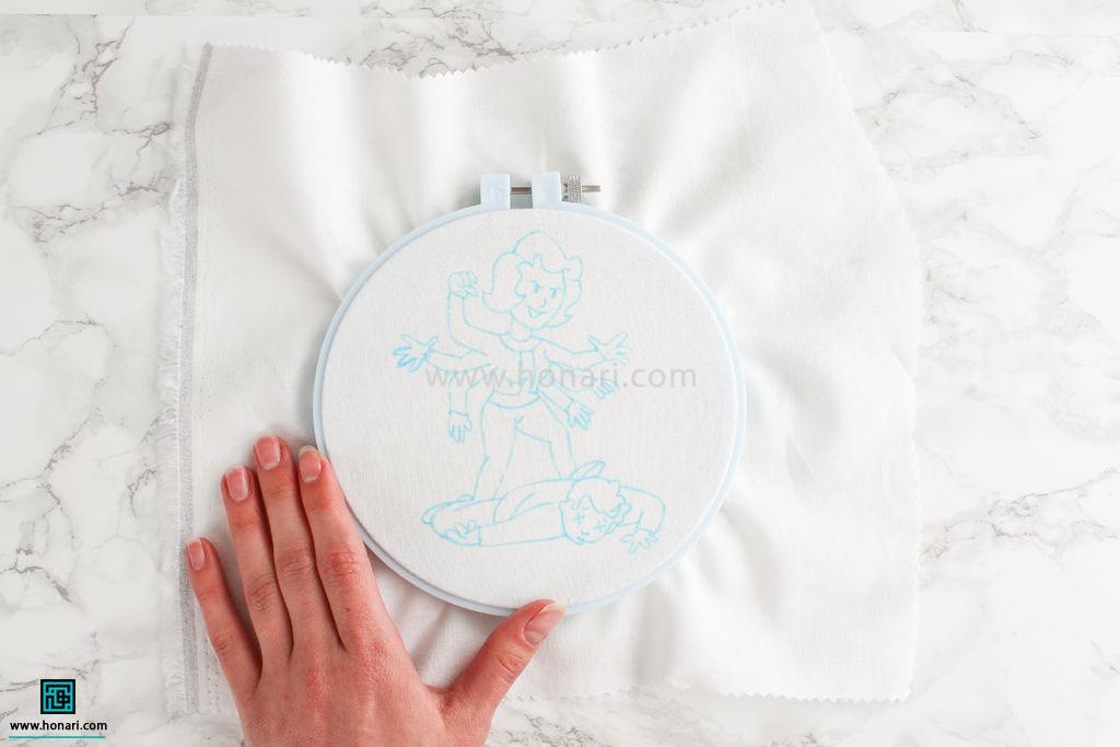 خیلی آروم و آهسته شروع به کشیدن پارچه کنید. پارچه را به نرمی روی کارگاه جابجا کنید تا طرح گلدوزی دقیقاً در وسط پارچه قرار بگیرد و کاملاً ثابت و محکم شود.