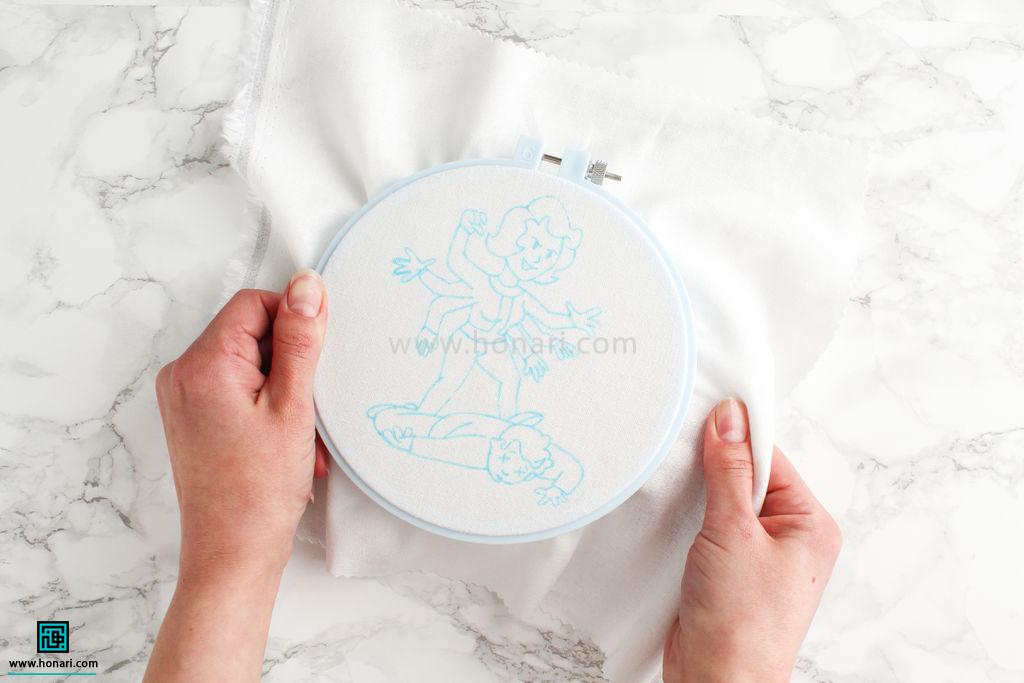 این عکس، یک نمونه از نقشههای گلدوزی شده روی پارچه را در داخل یک کارگاه نشان میدهد. یک نکته مهم این است که چه اندازهای از فضای کارگاه شما مورد استفاده قرار میگیرد. شما باید طرح خود را روی پارچه منتقل کنید و سپس حلقه گلدوزی را دور آن قرار دهید.