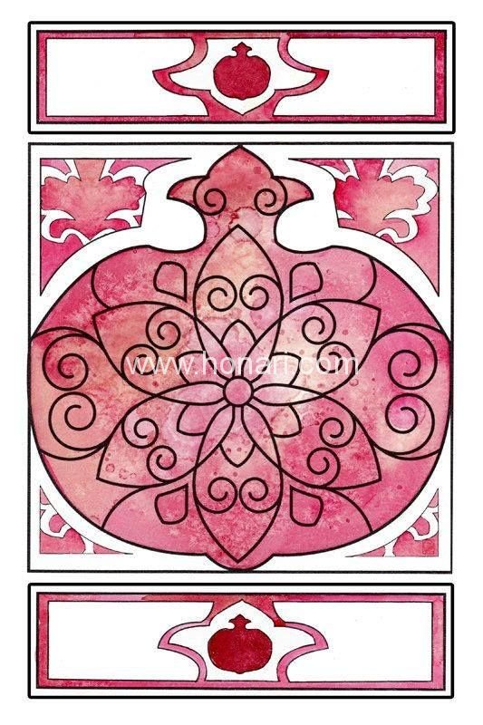 این طرح، یک نقش زیبا و ساده برای کشیدن روی پارچه با موضوع شب یلدا است. در مرکز این طرح، یک انار قرمز و آبدار قرار دارد که نماد برکت و شادی است. دور تا دور انار، برگهای سبز و شاداب دیده میشود.