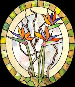 این طرح، یک قاب تزئینی زیبا با طرح گلهای پرنده بهشتی است. در این اثر از تکنیک ویترای (شیشهرنگ) استفاده شده که در آن قطعات شیشههای رنگی در کنار هم قرار میگیرند و با خطوط سرب به یکدیگر متصل میشوند تا یک تصویر کامل و درخشان را ایجاد کنند.