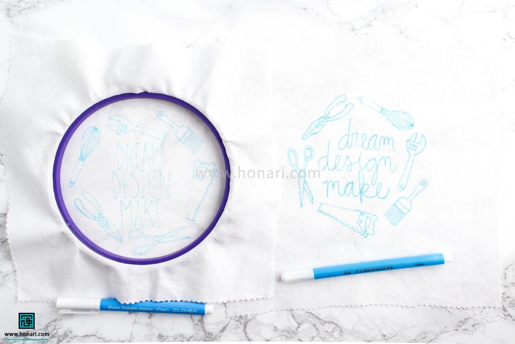 ابتدا پارچه را روی کارگاه گلدوزی سوار کنید و مطمئن شوید که طرح دقیقاً در مرکز قرار گرفته و خوب محکم شده است.