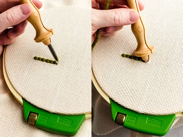 سوزن را به طور کامل داخل پارچه فرو ببرید، طوری که فقط بخش چوبی آن با پارچه در تماس باشد. بلندی سوزن باعث میشود حلقهها بلندتر شوند. اگر بین هر دو بخیه به یک اندازه فاصله بگذارید و سوزن را با همان نظم قبلی داخل پارچه کنید، در پایان کار همه حلقهها هماندازه و مرتب خواهند بود.