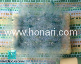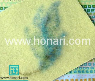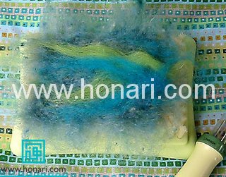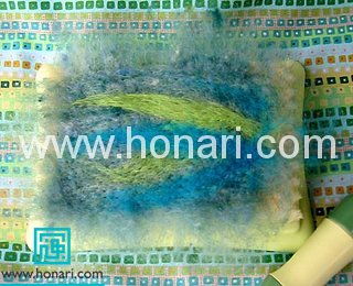 روشی که من استفاده کردم، باعث ایجاد طرحهای محکم و فشرده شده است. معمولاً وقتی با سوزن کار میکنیم، الیاف پشم مستقیماً روی پارچه قرار گرفته و در جای خود سوراخ ایجاد میشود.