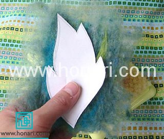 یک برگ کاغذی را به شکل برگ درخت برش میدهم. سپس الیاف را روی آن قرار میدهم و قسمتهای اضافی الیاف را با قیچی جدا میکنم تا کاملاً شبیه یک برگ طبیعی شود.