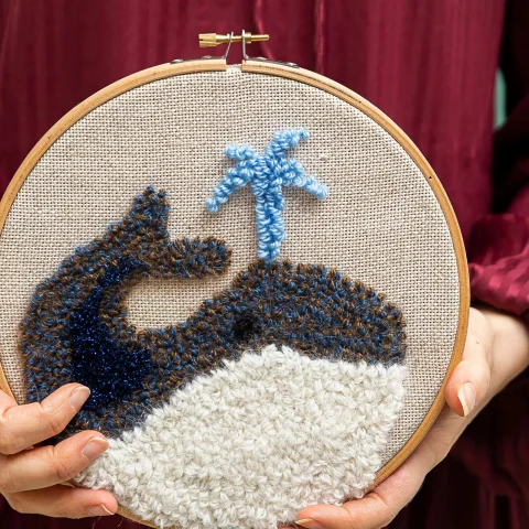 برای شروع، طرح مورد نظر را روی پارچه قرار دهید. سپس با کمک دستگاه پانچ، سوراخهای ریزی در پارچه ایجاد کنید. بعد از اینکه سوراخها را ایجاد کردید، کاموا را از داخل آنها رد کنید و در انتها گره بزنید.