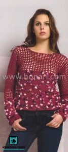 قسمت پایین بلوز: با نخ ماکسی فلور، ۵۰ دانه سر میاندازیم. دو رج رکن میبافیم و بعد از آن، ۳۰ سانتیمتر به روش ساده بافت را ادامه میدهیم. در پایان، همه دانهها را یکبهیک میبندیم. این کار را برای دو تکه جداگانه انجام میدهیم.