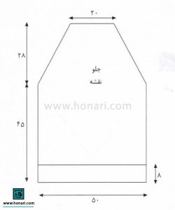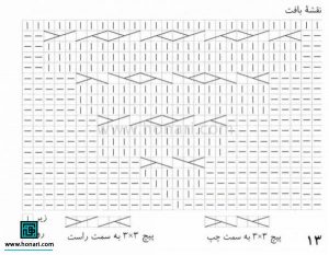 ابتدا از لبه یقه، به اندازه ۱۳ سانتیمتر، با روش دانهاندازی که در نقشه نشان داده شده است، کار بافتن را ادامه میدهیم. در پایان، دانهها را به آرامی از دستگاه بافندگی خارج میکنیم تا کار به پایان برسد.