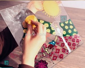 بعد از اینکه شیشه کاملاً تمیز شد، الگو را از پشت به شیشه میچسبانیم.