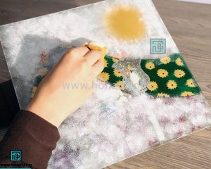 در این مرحله، نقاشی روی شیشه را شروع میکنیم. هنگام رنگآمیزی قسمتهای بزرگ، باید سریع عمل کنیم. اگر سرعت عمل نداشته باشیم، رنگ بعضی قسمتها خشک میشود و سطح کار به صورت یکدست و یکنواخت در نمیآید.