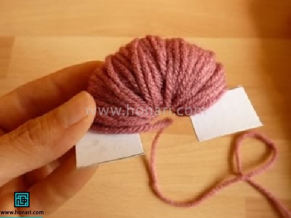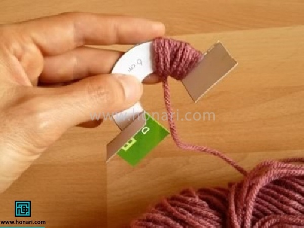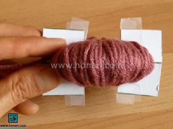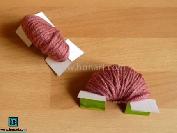 یک تکه کاموا بردارید و آن را از میان دو مقوا رد کنید. سپس دو سر کاموا را به هم گره بزنید و محکم کنید.
