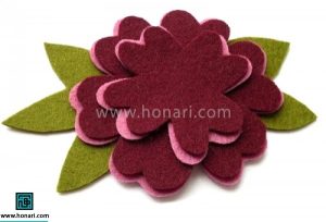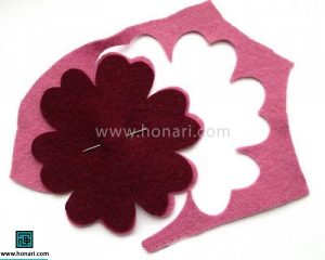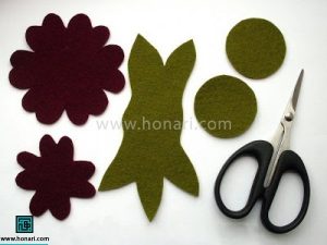 در آغاز کار، با کمک الگو (برای دریافت الگو روی گزینهٔ «دانلود فایل الگو» کلیک کنید) بخشهای مختلف گل را روی نمد رسم کرده و سپس آنها را با قیچی میبریم.