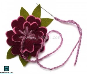 حالا که گل نمدی آماده شده، آن را از پشت به پارچه میدوزیم.