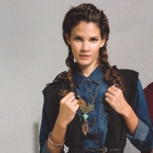 با ۸۵ دانه شروع می‌کنیم و ۵ رج به روش رکن می‌بافیم. بعد از بافتن ۸۰ سانتیمتر، برای قسمت حلقه آستین، از هر دو طرف مانند قسمت جلو عمل می‌کنیم. وقتی قد کار به ۱۰۰ سانتیمتر رسید، برای یقه از وسط کار ۱۰ دانه را می‌بندیم. در رج‌های بعدی، از هر دو طرف یقه، ۲ دانه دیگر می‌بندیم تا فقط ۲۰ دانه برای سر شانه‌ها باقی بماند. سپس این ۲۰ دانه را یکجا می‌بندیم. در ادامه، ریشه‌هایی به طول ۲۰ سانتیمتر به لبه‌های کار اضافه می‌کنیم. در پایان، نوارهای ۶ دانه‌ای قسمت جلوی کار را به یقه پشت وصل می‌کنیم.