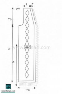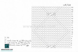 با نخ شماره ۱۵۱ لاناگُلد، ۴۵ دانه سر می‌اندازیم و ۵ رج رکن می‌بافیم. در قسمت جلو، ۶ دانه را به سبک رکن ادامه می‌دهیم و بقیه دانه‌ها را به این صورت مرتب می‌کنیم: ۸ دانه از رو، ۱۸ دانه با نقشه، ۱۳ دانه از رو.