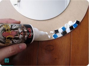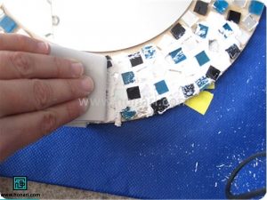 کاشیهای خردشده را با استفاده از چسب چوب روی سطح میچسبانیم.