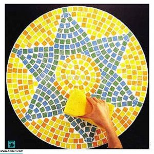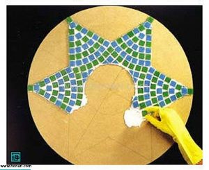 سطح مورد نظر را با چسب چوب آغشته کرده و تکه‌های کاشی شکسته را در محل خود قرار می‌دهیم و محکم می‌کنیم.