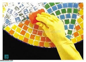 بعد از حدود یک ربع، ملات اضافی روی کاشی‌ها را با ابر تمیز می‌کنیم.