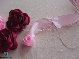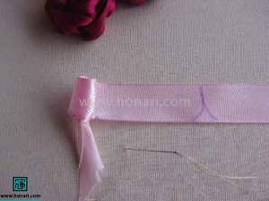 وقتی به انتهای روبان رسیدید، نخ را آرام بکشید تا روبان به صورت زیبا و منظم چین بخورد. سپس نخ را گره بزنید تا چینها محکم در جای خود باقی بمانند. در پایان، روبان را به آرامی دور خودش بپیچید تا فرم دلخواهتان ایجاد شود.