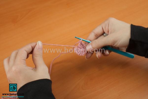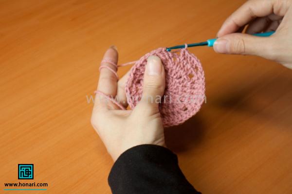 ردیف دوم: در یک حلقه، دو عدد پایه ببافید. سپس در حلقه بعدی، یک پایه بلند ببافید. بعد از آن، دوباره در یک حلقه، دو عدد پایه ببافید. سپس یک زنجیره ببافید. این الگو را تا پایان ردیف ادامه دهید.