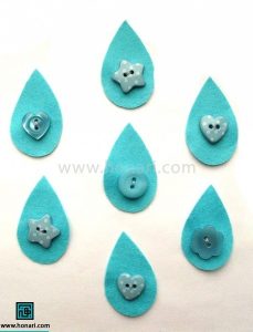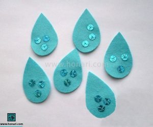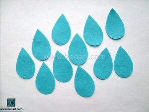 با کمک یک الگوی ابر، دو عدد ابر به رنگ خاکستری و چندین قطره باران به رنگ آبی از پارچه نمدی قیچی میکنیم.