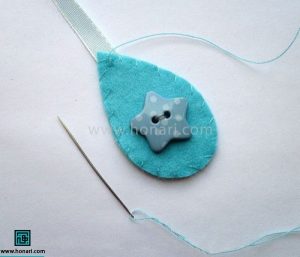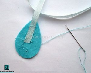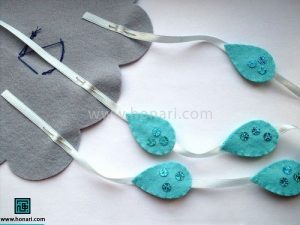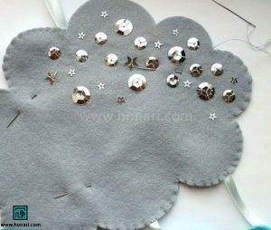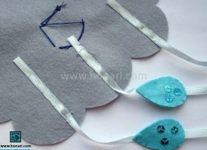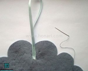 با یک نوار باریک نیم سانتیمتری، یک حلقه درست میکنیم و آن را به بخش بالایی ابر نمدی وصل میدوزیم.