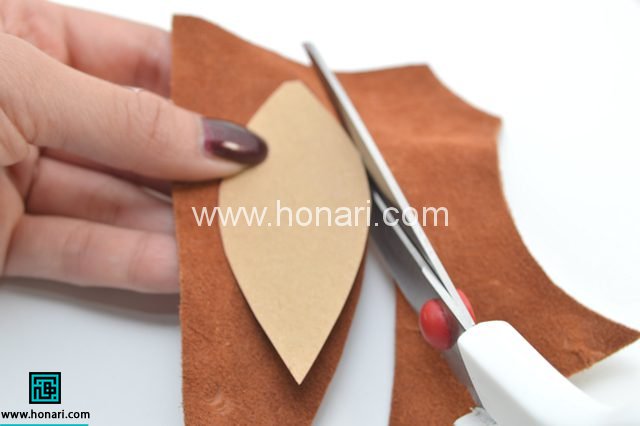 در مرحله بعد، مقوا را روی چرم قرار دهید و سپس با توجه به شکل و اندازه مقوا، چرم را برش بزنید و آماده کنید.