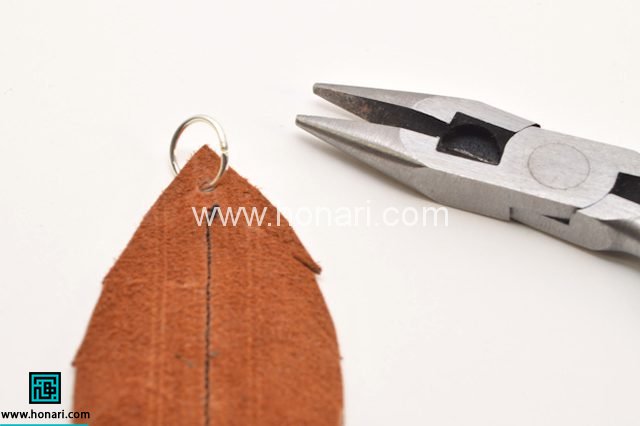 در مرحله ششم، با به کار بردن دم باریک، حلقهٔ اتصال را داخل سوراخی که با پانچ ساختهاید قرار دهید.