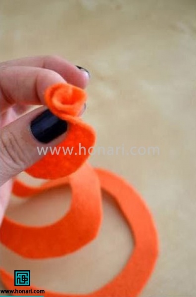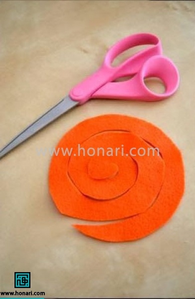 حالا نوبت برش دادن دایره نمدی است. باید آن را به شکل یک مارپیچ یا حلقههای دورانی از لبه به سمت مرکز، برش دهید.