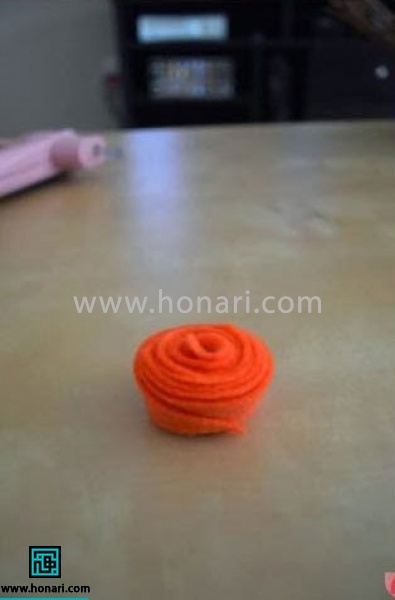 کار را از وسط دایره آغاز کنید و گلها را به دور آن بپیچید. بعد از هر بار چرخاندن کامل، مقداری چسب حرارتی بزنید تا گل کاملاً در جای خود ثابت شود.