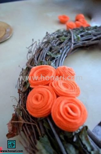 گلهای نمدی را روی حلقههای آماده شده بچسبانید. اگر حلقه آماده ندارید، میتوانید خودتان با استفاده از چند شاخه نازک درخت، یک حلقه درست کنید.