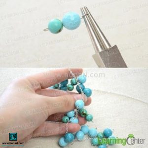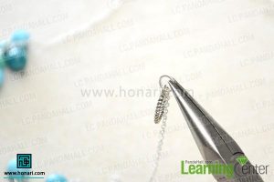 در این مرحله، چند تا از مهرهها را دو تا دو تا از سوزن مخصوص رد میکنیم و در انتهای آنها یک حلقه درست میکنیم. سپس هر کدام از این حلقهها را به زنجیر وصل کرده و با کمک انبر، محل اتصال را به خوبی محکم میکنیم.