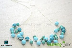 مهرهها را به بخش مرکزی زنجیر آویزان میکنیم. شما میتوانید چیدمان و ترتیب آنها را بر اساس سلیقه و نظر شخصی خودتان مرتب کنید.