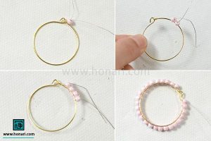 در این مرحله، برای هر سوزن میخی، یک مروارید و یک منجوق در نظر میگیریم و آنها را داخل سوزن قرار میدهیم. سپس نوک سوزن را به شکل یک حلقه درمیآوریم. بخش اضافی سوزن را هم با سیمچین جدا میکنیم. در پایان، این حلقهها را به سیمهایی که منجوقها را با آن بافتهایم، متصل میکنیم.