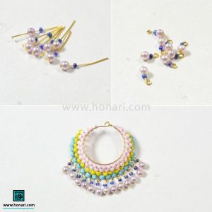 در این آموزش، یاد میگیرید که چطور یک گوشواره زیبا درست کنید. برای ساختن آن به این وسایل نیاز دارید: منجوقهای رنگی، مروارید سایز چهار، حلقه مخصوص گوشواره، سوزن میخی با ته تخت، سیم آلومینیومی و پایه گوشواره.