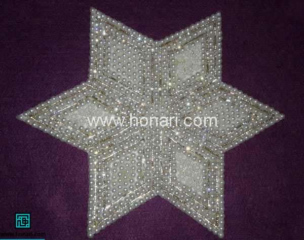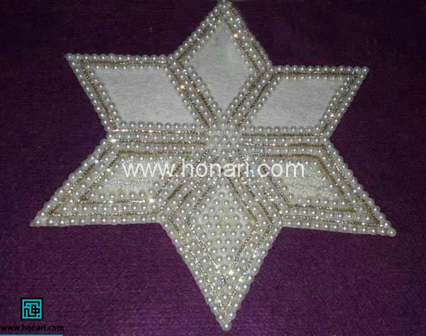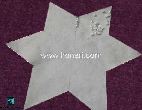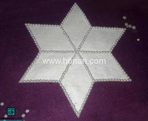بعد از این که دانههای مروارید را در قسمتهای داخلی کار چسباندیم، نوبت به لبهها میرسد. حالا باید دور تا دور ستاره را نیز با مروارید تزیین کنیم.
