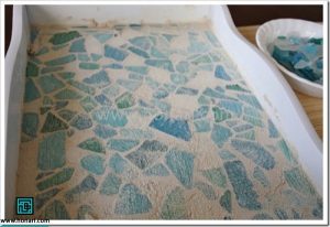 کاشی‌ها را به شکلی که دوست دارید، در کف سینی می‌چسبانیم.