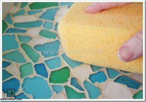 پس از حدود یک ربع، با استفاده از یک اسفنج، چسبی که روی سطح کاشی‌ها باقی مانده را تمیز می‌کنیم.