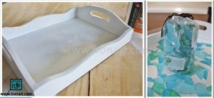 یک سینی چوبی، کاشی کریستالی، یک کاردک، پودر درزگیر و چسب چوب.