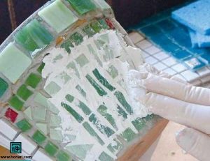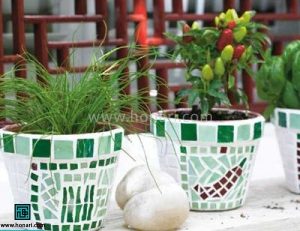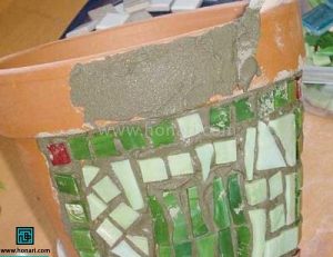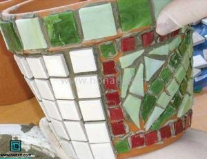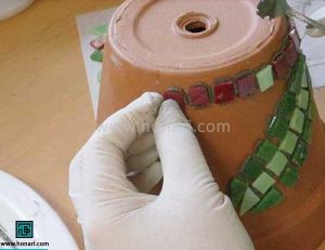 سپس قطعات کاشی را مطابق نقشه از پیش تعیین شده، روی سطح گلدان میچسبانیم.