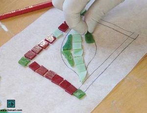 طرح را روی زمین پهن میکنیم و کاشیها را یکی یکی سر جای خود میگذاریم. با این کار، جای دقیق هر کاشی از قبل مشخص میشود.