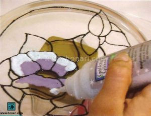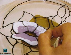 کاغذ الگو را زیر شیشه قرار میدهیم و طرح را روی شیشه با خمیر دورگیر رسم میکنیم.