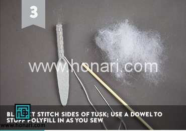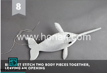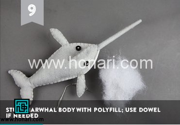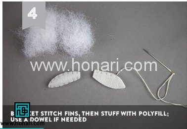 قسمتی که برای دم ماهی در نظر گرفتهاید را تا بزنید و لبههای آن را بدوزید. سپس با کمک یک وسیلهی نازک و بلند، کمی پنبه یا مواد نرم دیگر را به آرامی داخل آن پر کنید.