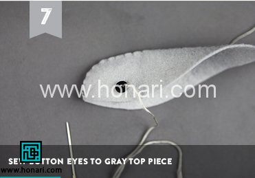 دو دکمه را در دو طرف بخش خاکستری رنگ بدوزید. این دکمهها در واقع چشمهای نهنگ خواهند بود.