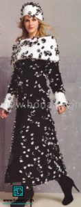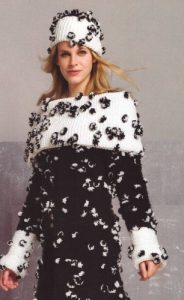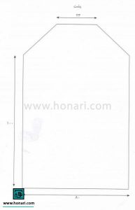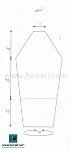 **یقه:** با رنگ شماره ۵۱۰۸ از نخ پونپونلا، ۷۰ دانه روی میل میاندازیم. سپس با روش رکن بافت را ادامه میدهیم. وقتی طول کار به ۱۱۰ سانتیمتر رسید، همه دانهها را یکجا از میل خارج میکنیم (میبندیم). در پایان، قسمت بافته شده را از طول تا میزنیم و لبه کناری آن را به خوبی میدوزیم تا کامل شود.