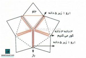 در دو طرف کار، بعد از یک دانه زیر، یک دانه رو، یک دانه زیر و یک دانه رو، یک دانه کم کنید. وقتی هشت دانه باقی ماند، همه را با هم ببندید.