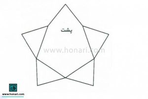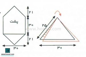 بعد از این مرحله، کار را برعکس انجام میدهیم. در هر رج، از هر دو طرف چپ و راست، یک دانهی نبافته را میبافیم. این کار را ادامه میدهیم تا تعداد دانهها دوباره به ۴۰ برسد. به این ترتیب، پشت قسمت سهگوش کامل میشود.