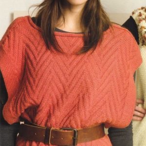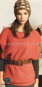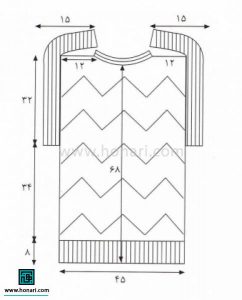 برای قسمت سجاف و لبه آستین، از هر دو طرف ۱۶ دانه اضافه کنید و با روش بافت یک رو، یک زیر ادامه دهید. وقتی قد کار به ۶۸ سانتیمتر رسید، ۳۲ دانه از وسط را ببندید. در رجهای بعدی، از دو طرف این ۳۲ دانه، ۶ مرتبه و سپس ۸ مرتبه دانه کم کنید.