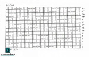 با نخ لاناگلد فاین به رنگ مرجان، 120 دانه سر بیندازید. سپس به اندازه ۸ سانتی متر با روش بافت کشباف (یک دانه رو، یک دانه زیر) کار را ادامه دهید. بعد از آن، نقشه اصلی را شروع کرده و حدود ۳۴ سانتی متر ببافید.