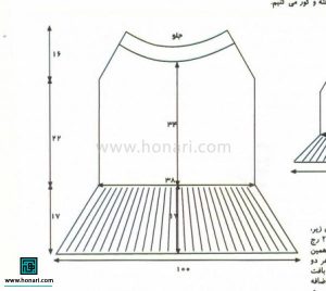 مانند قسمت جلو شروع به بافتن کنید. زمانی که طول بافت به ۴۵ سانتیمتر رسید، کار بافت را از وسط به دو قسمت تقسیم کنید.